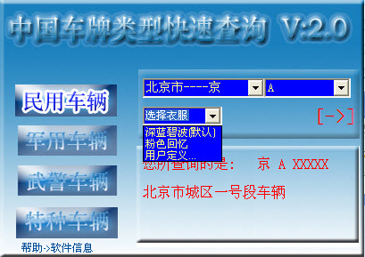 中國車牌類型查詢器是一款車牌號查詢工具,能幫助用戶查詢車牌號所在地,車牌號的類型(軍車、民用車)的信息。中國車牌類型查詢器是一個簡單的車牌號查詢工具,滿足用戶常識性的需求,相關信息有可能有偏差,請不要完全對照。