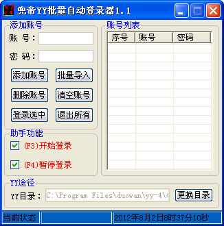 兜帝YY批量自動登錄器是一款yy多開器支持YY4.16版本多開。歪歪多開器其他功能在更新中....