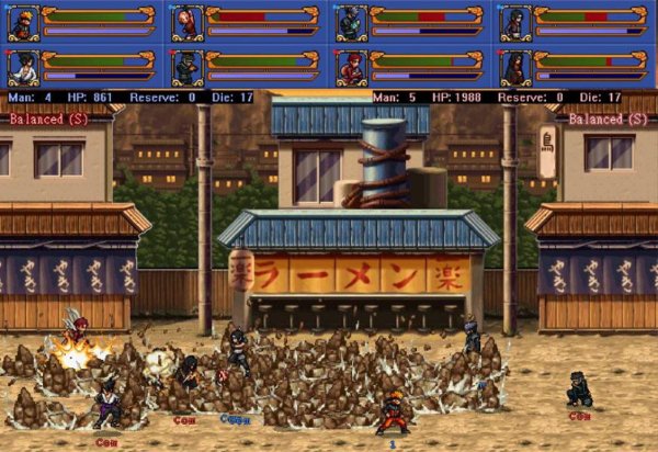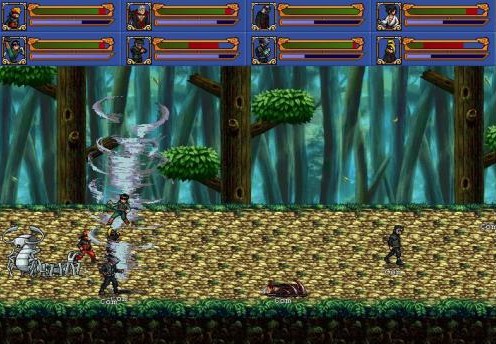 游戲中共有25個(gè)角色(不包括隱藏人物及人物補(bǔ)丁),最多能夠八個(gè)角色同時(shí)混戰(zhàn)!玩家可與計(jì)算機(jī)或其它玩家分組聯(lián)合作戰(zhàn),亦可選用淘汰賽模式。格斗時(shí)天空會(huì)隨機(jī)地降下各種武器、道具。每個(gè)角色都有自己相應(yīng)的必殺技(部分角色不止一個(gè)哦),當(dāng)藍(lán)色聚氣條(查克拉)足夠時(shí)就能夠發(fā)出它們(耗氣量因人而異,當(dāng)然一些其他招也是需查克拉的,因?yàn)槭腔鹩鞍?。