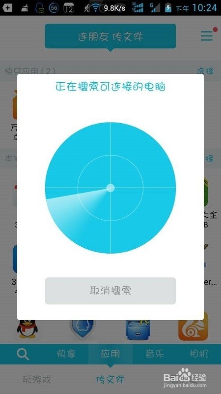 現(xiàn)在,我們開始進(jìn)行電腦向手機(jī)傳文件吧,如圖,點(diǎn)擊電腦中的“傳文件”按鈕,選擇文件后進(jìn)行傳輸。
