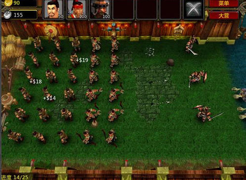 在14波的時(shí)候,你得補(bǔ)民兵,記住要做一個就隔開一個格子,因?yàn)槊癖泄舴秶?,這樣才能夠最大限度的讓他攻擊發(fā)揮出來,到了后面關(guān)卡的宗旨是哪里來蜘蛛就拿民兵堵住那一行