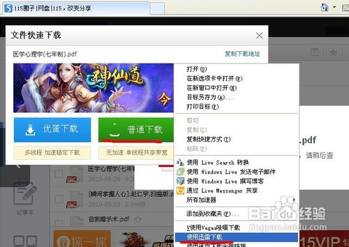 如下圖所示,我們再在彈出的下載通道選擇頁面右擊“普通下載”,然后在彈出的菜單項里選擇“使用迅雷下載”