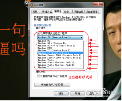 我們在選擇兼容模式時,可以把它支持的模式都試試,找到適合自己電腦系統(tǒng)的,如圖;