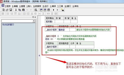 進(jìn)入模塊編寫(xiě)界面,真是別有洞天啊。首先有必要講一下易語(yǔ)言的初始化代碼,看注釋部分就明白,這段代碼是用作測(cè)試程序用的,如果實(shí)在不理解,直接無(wú)視就OK!