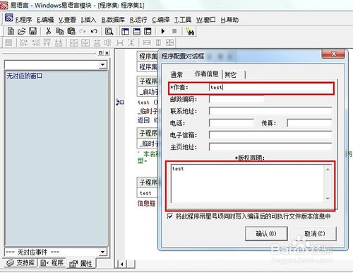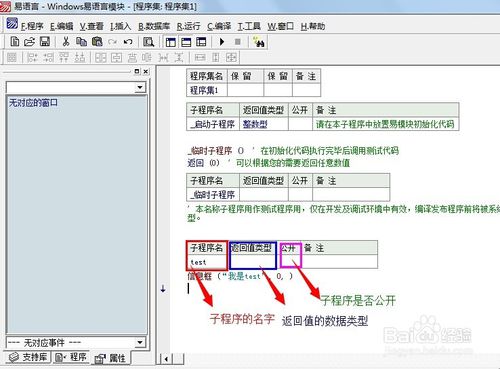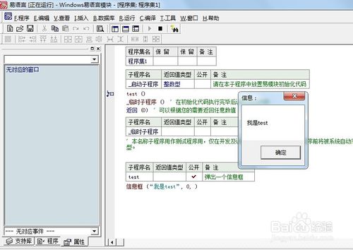 開(kāi)始“實(shí)兵演練”,可通過(guò)單擊鼠標(biāo)右鍵彈出菜單并選擇“新建子程序”或者按下Ctrl+N鍵的方式來(lái)新建子程序,今天我們就新建一個(gè)名叫“test”的子程序,這里有必要說(shuō)一下相關(guān)注意事項(xiàng):(1)子程序的名字要唯一(2)根據(jù)子程序的需要,設(shè)置返回值的數(shù)據(jù)類(lèi)型,如果無(wú)返回值,可留空。(3)設(shè)置子程序的公開(kāi)屬性,模塊是方便其他程序猿調(diào)用的,所以公開(kāi)要打勾。(4)為了便于程序的開(kāi)發(fā)編寫(xiě),做好備注是個(gè)好習(xí)慣。提示自己及其他人此子程序的功能是什么。接下來(lái),就是寫(xiě)代碼了,我們就以信息框?yàn)槔?寫(xiě)完代碼記得將公開(kāi)打“√”和添加備注。