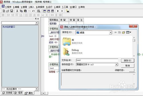 配置模塊信息完成,開(kāi)始封裝模塊吧。萬(wàn)事俱備,只欠編譯。點(diǎn)擊菜單欄“編譯”→“編譯”,進(jìn)入模塊編譯對(duì)話框,填寫(xiě)模塊名稱(chēng),點(diǎn)擊“保存”即可,至此易語(yǔ)言編寫(xiě)模塊圓滿結(jié)束。