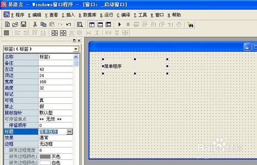在組件工具箱上,鼠標(biāo)選擇標(biāo)簽控件,拖放到窗口上,并在標(biāo)簽的屬性窗口上,將其標(biāo)題修改為(簡(jiǎn)單程序),如下圖所示。