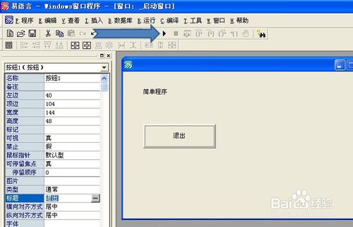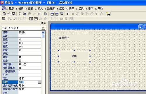 接著再添加一個(gè)控件,在組件工具箱上,鼠標(biāo)選擇按鈕控件,拖放到窗口上,并在按鈕的屬性窗口上,將其標(biāo)題修改為(退出),這樣一個(gè)最簡(jiǎn)單程序的窗口界面就做好了,如下圖所示。