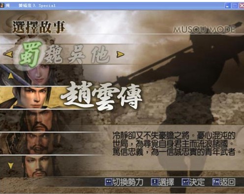 真三國無雙4猛將傳圖文攻略概況:控制一名武將(能力、武器初期設(shè)定),無限關(guān)卡,敵兵不掉回復(fù)道具。不能獲得新武器,只能強(qiáng)化初期武器。無法存檔,只能中斷儲(chǔ)存,讀檔即消原檔(對(duì)策是2塊記憶卡互相考)。