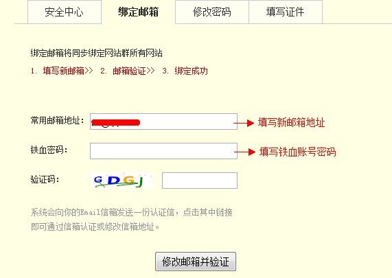 填寫新的郵箱地址,并填寫鐵血賬戶密碼和驗證碼,點擊“修改郵箱并驗證”,系統(tǒng)會自動往您提供的郵箱中發(fā)一封驗證郵件;