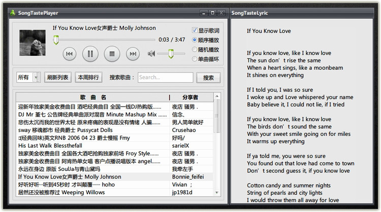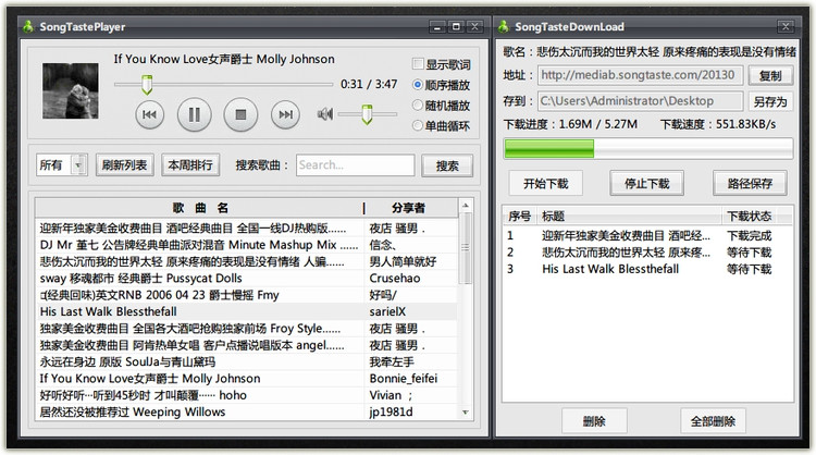 破解嗅探SongTaste下載的方法很多,但都過(guò)于麻煩,推薦 SongTastePlayer 這款專門針對(duì)SongTaste下載的小工具,可以試聽,搜索,顯示歌曲,和下載SongTastePlayer里面的音樂(lè)??旖萱I—— ”下一曲”:Ctrl+→ ; ”上一曲“:Ctrl+←SongTaste對(duì)外鏈讀取進(jìn)行限制,所以盡量避免對(duì)歌曲的頻繁切換。