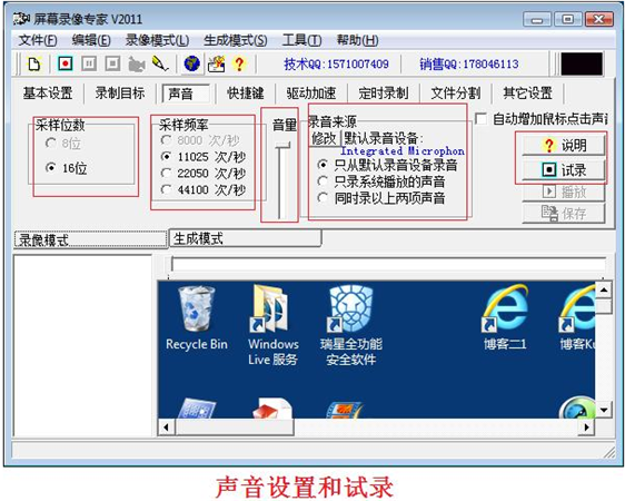 3. 聲音設(shè)置和試錄:建議采用原始設(shè)置,“錄音來(lái)源”也可設(shè)置為麥克風(fēng)( Microphone)。