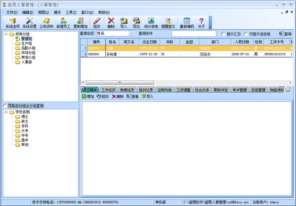 超易人事管理軟件主要功能分為基本信息維護、員工照片、工作經歷、教育經歷、培訓記錄、證書列表、工資調整、社會關系、職稱評定、考評管理、獎懲管理、物品領用、系統(tǒng)維護、自定義排序,重新編碼等功能點。
