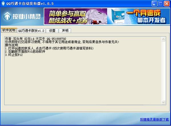 QQ巧遇卡是qq2012最新的一個(gè)功能,這款QQ巧遇卡輔助可以自動(dòng)發(fā)布消息,按下F10就等著帥哥美女來(lái)與你巧遇吧。