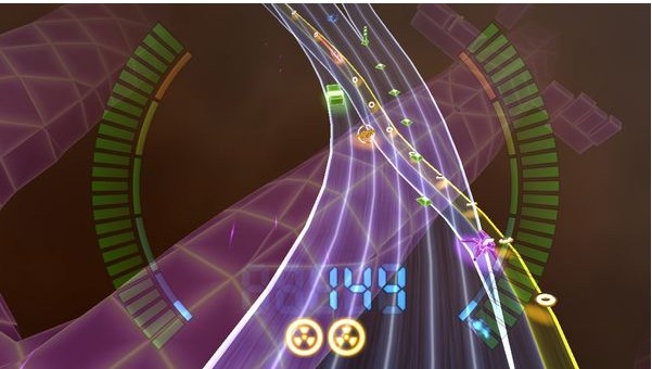 畫 面:游戲的畫面采用3D平臺的賽道模式,抽象幾何圖像來表示賽車比賽中的各種不同元素,看似簡單,但也具備很出色的表現(xiàn)力。各種元素呈現(xiàn)出獨特的質(zhì)感,特別是絢麗的光影效果是真實賽車難以表現(xiàn)出來的。