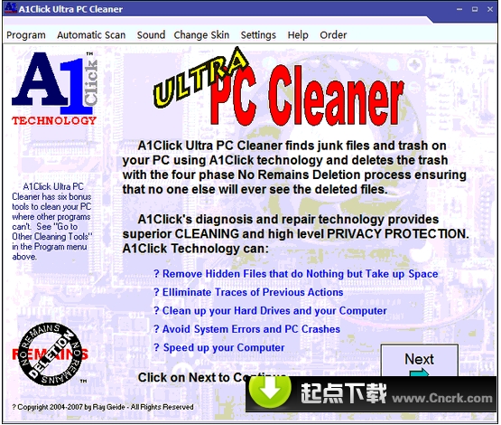 A1Cleaner 是注冊(cè)表吸塵器 (RegVac) 的姐妹產(chǎn)品. 是一款超強(qiáng)的系統(tǒng)清潔工具. 它可以掃描系統(tǒng)中 70 多種的LJ文件, 并且附帶七個(gè)額外的清潔工具. 同時(shí)它還有強(qiáng)大的恢復(fù)功能,每次清理前它都會(huì)將要?jiǎng)h除的文件打包成一個(gè)壓縮包, 萬(wàn)一出問(wèn)題了可以方便的恢復(fù). 同時(shí), 它在刪除文件時(shí)會(huì)自動(dòng)檢測(cè)此文件的重要性, 提示你進(jìn)行相關(guān)的操作.