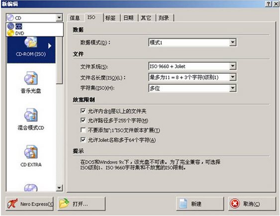 彈出新編輯對話框,在對話框左上方可以選擇你的光盤類型(CD或是DVD),如圖