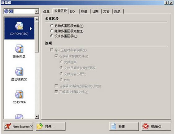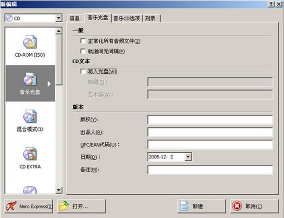 軌道音無間隔的意思就是你所刻錄的音樂之間沒有時間間隔,NERO默認(rèn)的是有2秒的時間間隔的。點擊“新建”按鈕,彈出界面,如圖