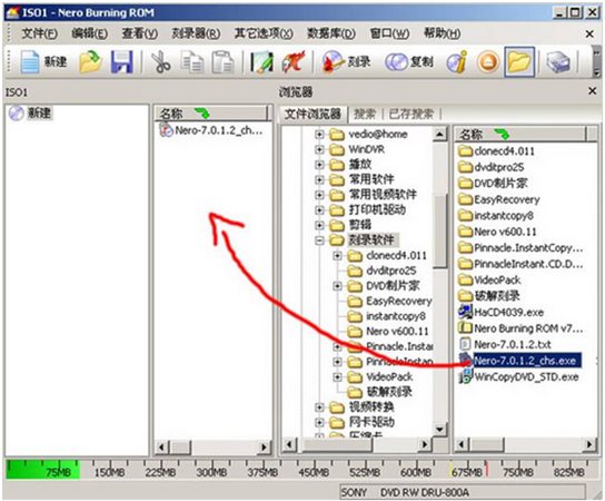 這時只需在文件瀏覽器中找到自己想刻錄的文件直接拖到圖中紅色鍵頭所指的區(qū)域就可以了,然后點擊上圖上方的按鈕就可以進(jìn)行刻了!