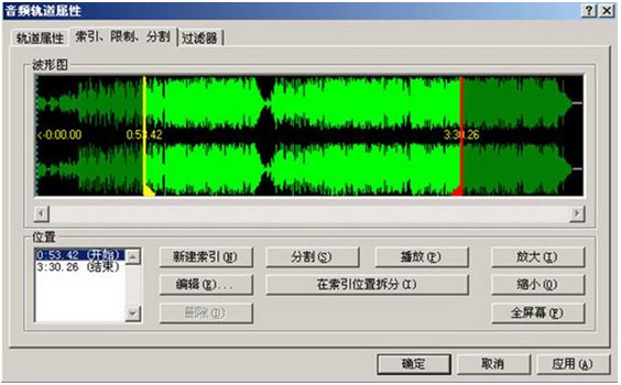 切換到“索引、限制、分割”界面還可以對所選定的音樂進(jìn)行編輯,如從什么時候開始什么時候結(jié)束等。