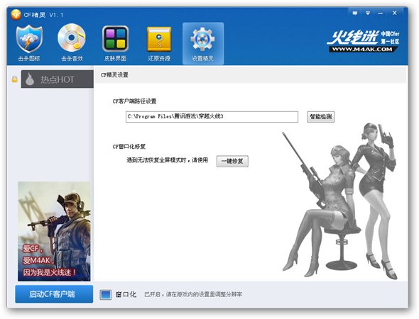 CF精靈是由cf火線迷社區(qū)開(kāi)發(fā)的專業(yè)的、免費(fèi)的CF窗口化工具,是目前最實(shí)用的CF輔助工具,完美支持穿越火線,擁有最完善的任務(wù)指引,超炫的游戲界面優(yōu)化。CF精靈窗口化工具下載功能齊全、綠色無(wú)毒(不是外掛,不會(huì)被封號(hào)),包括擊殺圖標(biāo)、擊殺音效、還原資源、皮膚界面等。
