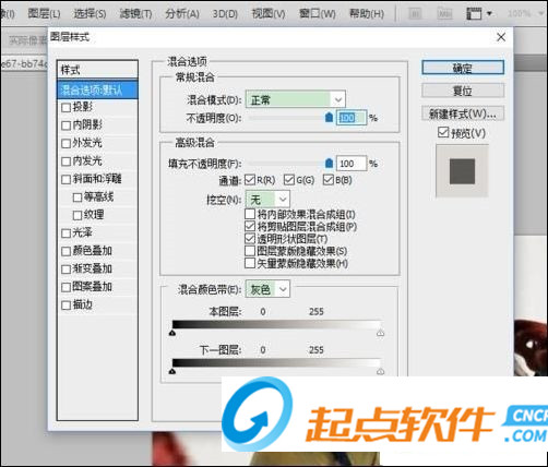 菜單欄:圖層——圖層樣式——混合選項(xiàng)。
