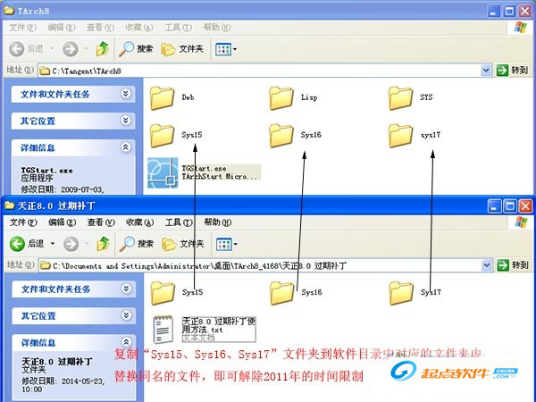 7、打開軟件包中的天正建筑8.0過(guò)期補(bǔ)丁,復(fù)制“Sys15、Sys16、Sys17”文件夾到軟件目錄中對(duì)應(yīng)的文件夾內(nèi)替換同名的文件,即可解除2011年的時(shí)間限制;