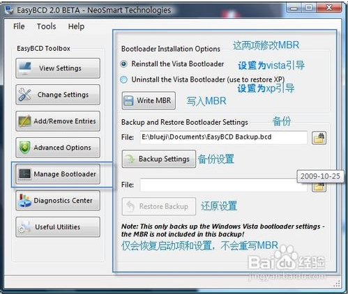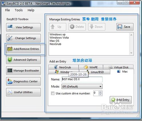 EasyBCD是修改vista和7啟動(dòng)引導(dǎo)信息很方便的軟件,功能也很多,昨天收到了最新版的下載.因?yàn)楣俜讲辉试S發(fā)布鏡像,所以需要最新版的可到論壇下載。新版增加了對(duì)VHD的支持??梢詾閂HD系統(tǒng)添加啟動(dòng)項(xiàng)。相對(duì)于1.7macosx的引導(dǎo)方式也增加了EFi直接引導(dǎo)。方法/步驟