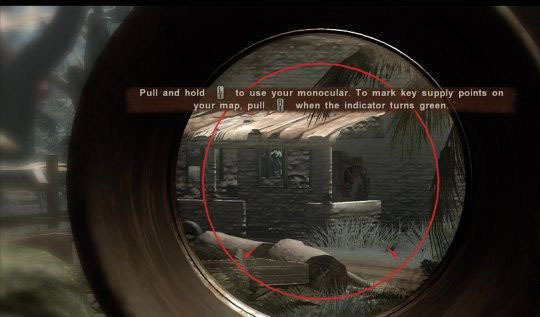 解決敵人后,即會(huì)接到中尉的來(lái)電說(shuō):「做得好,我接下來(lái)還有一些家務(wù)事要你來(lái)幫忙。你就稍作休息等候指示吧?!?br />進(jìn)入安全集合點(diǎn)后,便可發(fā)現(xiàn)一張行軍床!接近按下Y鍵便可設(shè)定鬧鐘(可隨意設(shè))設(shè)完后,即可開(kāi)始休息以及存檔!休息完之后,走出安全集合點(diǎn)的小房,便會(huì)再度接到中尉的來(lái)電指示下一步任務(wù):「到地圖上所標(biāo)示的營(yíng)地,然后觀察營(yíng)地內(nèi)有何資源并加以回報(bào)?!?br />到達(dá)營(yíng)地時(shí),千萬(wàn)不要直接開(kāi)車沖進(jìn)去,因?yàn)檫@次任務(wù)只是要偵察而已。于是在進(jìn)入營(yíng)地前便下車走向左邊的山丘上按下back鍵拿起地圖,并按下LT鍵即可用偵察鏡觀察。當(dāng)鏡內(nèi)圓心變綠時(shí)按下RT即可標(biāo)點(diǎn),標(biāo)完點(diǎn)后會(huì)再度接到上尉的來(lái)電,指示主角要進(jìn)入營(yíng)地并救出俘虜。當(dāng)然送佛送上天!主角當(dāng)然也義不容辭的勇往直前給他殺進(jìn)去!這邊要注意的是在俘虜室旁的機(jī)槍座,一定要先把機(jī)槍的人作掉,不然很容易就會(huì)被掃掛。所有馀黨解決后,便進(jìn)入地圖標(biāo)點(diǎn)處營(yíng)救俘虜,任務(wù)完成。