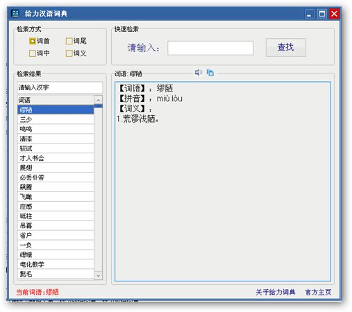 給力漢語(yǔ)詞典是綠色免費(fèi)軟件,收錄詞語(yǔ)41萬(wàn)多條,是目前收錄最多的新華詞典、漢語(yǔ)大詞典。每個(gè)詞條都有詳細(xì)的拼音和解釋?zhuān)豢砂丛~首、詞尾、詞中、詞義檢索。程序自帶中文真人語(yǔ)音朗讀功能,詞語(yǔ)及解釋可以進(jìn)行全文朗讀,是一個(gè)優(yōu)秀的學(xué)習(xí)工具。