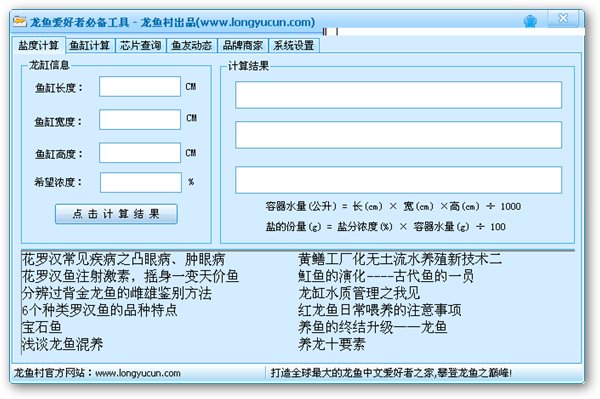 龍魚愛(ài)好者工具是龍魚村根據(jù)飼養(yǎng)龍魚中常遇到的魚缸計(jì)算、溫度計(jì)算、鹽度計(jì)算、芯片查詢等常見(jiàn)計(jì)算、查詢方式。龍魚愛(ài)好者工具更方便了龍魚愛(ài)好者飼養(yǎng)自己的龍魚。
