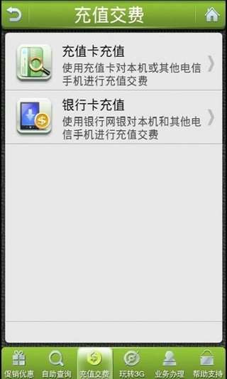 提供充值卡充值及翼支付功能,可進行相關(guān)費用及賬單的支付。