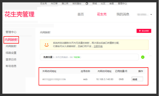 3、點擊客戶端內(nèi)網(wǎng)映射,則跳轉(zhuǎn)至花生殼管理的內(nèi)網(wǎng)映射頁面,