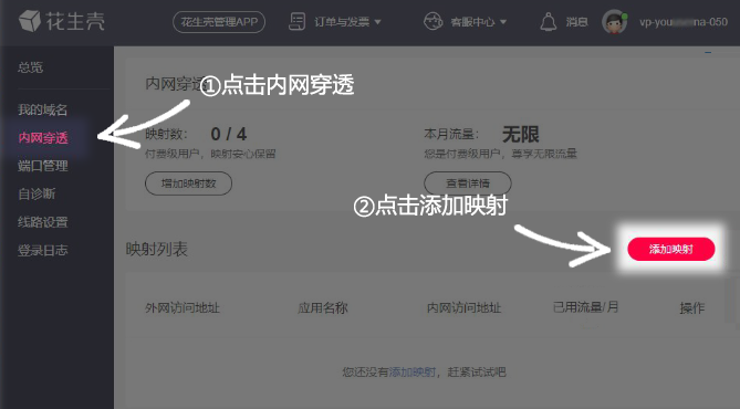 ①點擊【內(nèi)網(wǎng)穿透】——【添加映射】