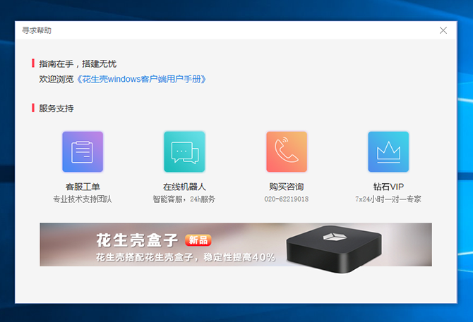 4、若在使用過程中遇到問題,點擊客戶端右上方【尋求幫助】,可自行查看《花生殼Windows客戶端用戶手冊》;也可通過下面4種途徑:“客服工單”,“在線機器人”,“購買咨詢”,“鉆石VIP”提交問題給我們的工程師查看解決。