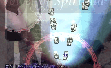 ·魔理沙(戀)的貫通激光在后三面對付成群且硬的大型雜魚效果不錯,絕對直線的攻擊也大大降低了意外破碟以及飛碟飛走的可能性。但是子機射擊時的光效和青色光彈差別不大,自帶閃瞎眼特效,自機周圍有彈幕的時候容易判斷失誤而發(fā)生意外(尤其是高難度下)。bomb主要注意一定要瞄準(大約就是低速激光那么大的范圍)才有完整的傷害,偏一些就只有一半傷害,視覺范圍外則完全沒有傷害。直線機的共有劣勢在于道中會比較混亂,配合80%減速的bomb你就會發(fā)現(xiàn)甚至無法躲開朝自機沖過來的飛碟,需要嚴格規(guī)劃放B開碟的路線。