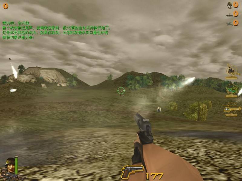 手槍呢,竊以為用之要慎。鬼子近身一般你就沒什么好果子吃了,所以盡量不要讓他們近身。萬一被鬼子包圍,手槍也顯得單薄一些,也許用轉(zhuǎn)輪機槍圈掃解圍效果會更好。