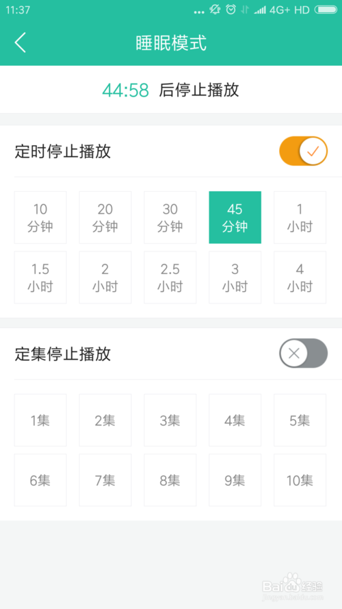 我們選擇“定時(shí)停止播放”,然后在時(shí)間列表上選擇一個(gè)時(shí)間,例如選擇45分鐘,則45分鐘后自動(dòng)停止播放。