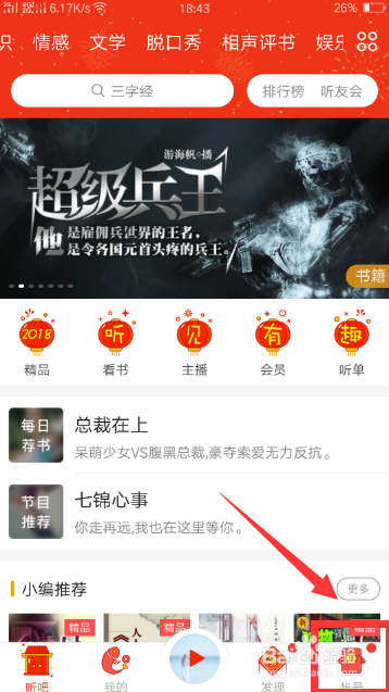 聽(tīng)吧社區(qū):UGC頻道,匯聚大量國(guó)內(nèi)主播上傳分享的網(wǎng)絡(luò)電臺(tái)節(jié)目,節(jié)目以脫口秀、心情講述、笑話(huà)段子、健康養(yǎng)生、廣播劇為主。普通用戶(hù)可以在社區(qū)內(nèi)關(guān)注主播和訂閱節(jié)目,可以分享交流有聲閱讀資源。