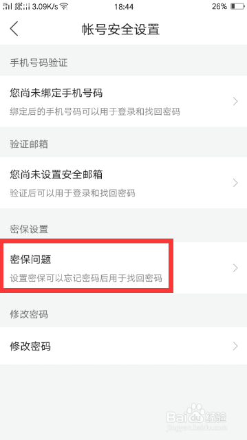 【賬號(hào)安全設(shè)置】的頁(yè)面,在“密保設(shè)置”這一項(xiàng),點(diǎn)擊“密保問(wèn)題”。