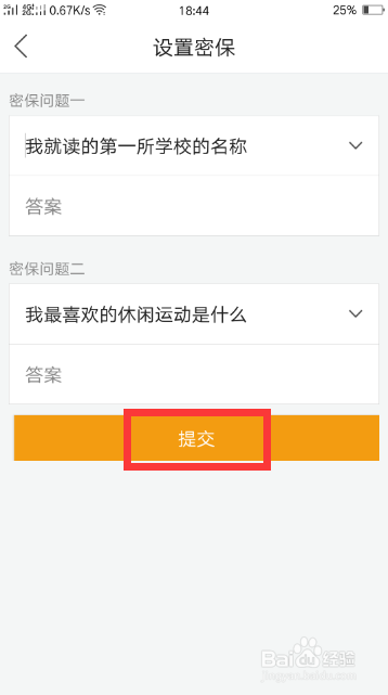 【設(shè)置密?!康捻?yè)面,輸入密保問(wèn)題一的答案,也可以自己選擇密保問(wèn)題,再設(shè)置密保二的答案,密保答案輸入完后點(diǎn)擊“提交”。