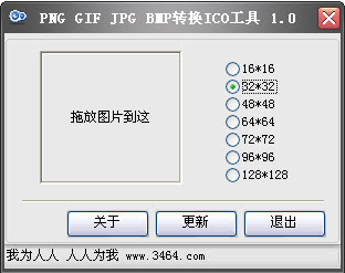 PNG GIF JPG BMP轉換ICO工具 1.1 免費版 PNG GIF JPG BMP轉換ICO工具是一個輕量級的免費圖形轉換工具,可以將PNG GIF JPG BMP格式的圖形文件轉換為ico圖標。它使用方便,只要鼠標拖拉一下就可以完成轉換。