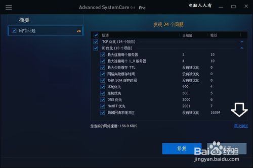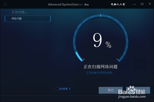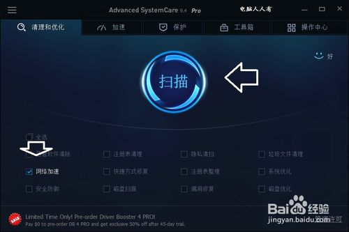 然后,打開Advanced SystemCare軟件→勾選網(wǎng)絡(luò)加速(首次掃描可以單項檢測,以便檢驗實測效果)→掃描。