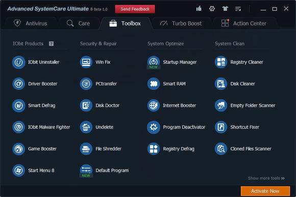 Advanced SystemCare除了提供一鍵維護和加速優(yōu)化功能,還集成了一個萬能的【工具箱】。包括安全修復(fù)、系統(tǒng)優(yōu)化和系統(tǒng)清理三個分類,與IObit自家其他產(chǎn)品組合超過20多款小工具。更難得的是,這些小工具都可以免費使用。