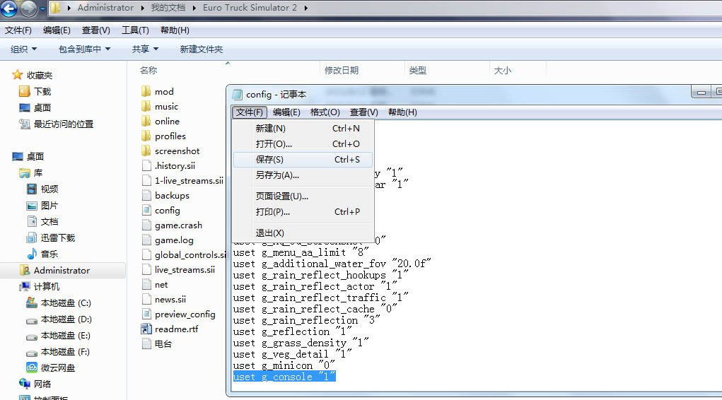 用記事本方式打開X:\Documents(我的文檔)\Euro Truck Simulator 2\ 下面的 config.cfg 文件