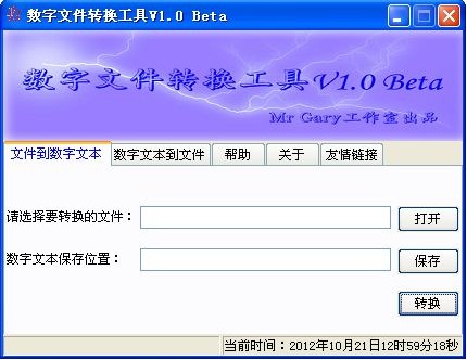 數(shù)字文件轉(zhuǎn)換工具V1.0 Beta是一款能將任何文件轉(zhuǎn)換到數(shù)字文本的工具,有了他,您就可以把任意文件轉(zhuǎn)換到數(shù)字文本并保存為文本文檔(*.txt),并可以把數(shù)字文本還原到原來的文件。