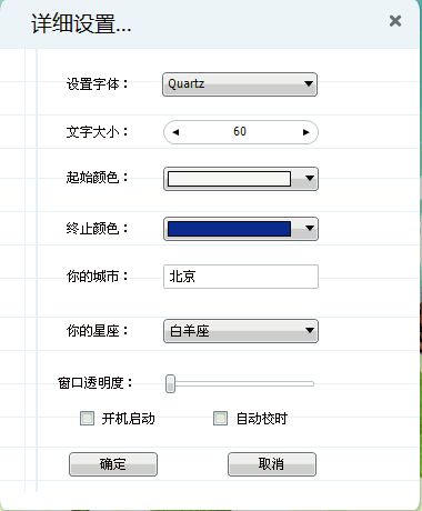 浪跡超酷時(shí)鐘是一款非常實(shí)用的小工具,不光在桌面顯示漂亮的電子時(shí)鐘,還具有天氣預(yù)報(bào)、星座運(yùn)勢(shì)、黃歷查看、定時(shí)關(guān)機(jī)等實(shí)用功能,時(shí)鐘的顏色字體都可以設(shè)置。