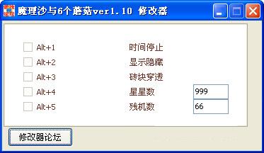 魔理沙與6個蘑菇修改器功能: alt+1 時間停止 alt+2 顯示隱藏 alt+3 磚塊穿透 alt+4 星星數(shù)修改 alt+5 殘機數(shù)修改為制定的數(shù)量 需要進入游戲后才能使用