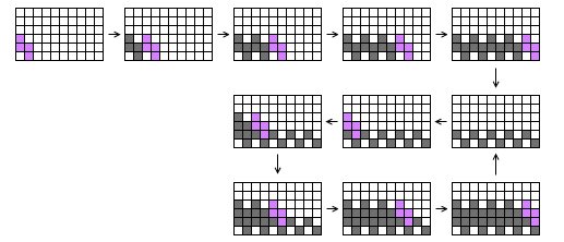 俄羅斯方塊真的不可能玩死嗎?1988年,John Brzustowski的一篇論文指出,俄羅斯方塊游戲無解并非不可能。它給出了一種算法可以保證游戲機能夠害死玩家,即使我們要求它必須提前向玩家展示出下一個方塊的形狀。構(gòu)造的關(guān)鍵在于,整個游戲的局面?zhèn)€數(shù)是有限的(2的200次方),如果玩家一直不死,在某一時刻必然會重復某一狀態(tài)。我們把兩次重復狀態(tài)及其之間的游戲過程叫做一個“循環(huán)”,這個循環(huán)實際影響到的那些行就叫做“實際循環(huán)區(qū)”。例如,圖2就是一個循環(huán),這個循環(huán)的“實際循環(huán)區(qū)”是從第4行到第7行這四行。