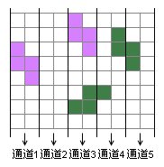 我們把寬為10的游戲區(qū)域劃分為5個寬為2的“通道”,從左至右用1到5標號。注意到圖1和圖2中的兩個循環(huán)都有一個共同點:每個“S”形方塊最終都完全落在某個通道內(nèi)。事實上,對于任意一個只有“S”形方塊的循環(huán),我們都有這個結(jié)論。也就是說,如果游戲機一直給你“S”形的方塊,你卻用它們弄出了一個循環(huán),那只有一種可能:所有“S”形方塊的下落位置都沒有跨越通道(就像圖3中的紫色方塊那樣,而非綠色方塊那樣)。